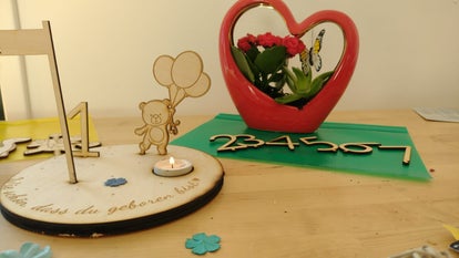 Dieser Geburtstagsteller kann individuell beschriftet werden, z,B, Name, Geburtsdatum oder der Name wird auf die Fahne gelasert.